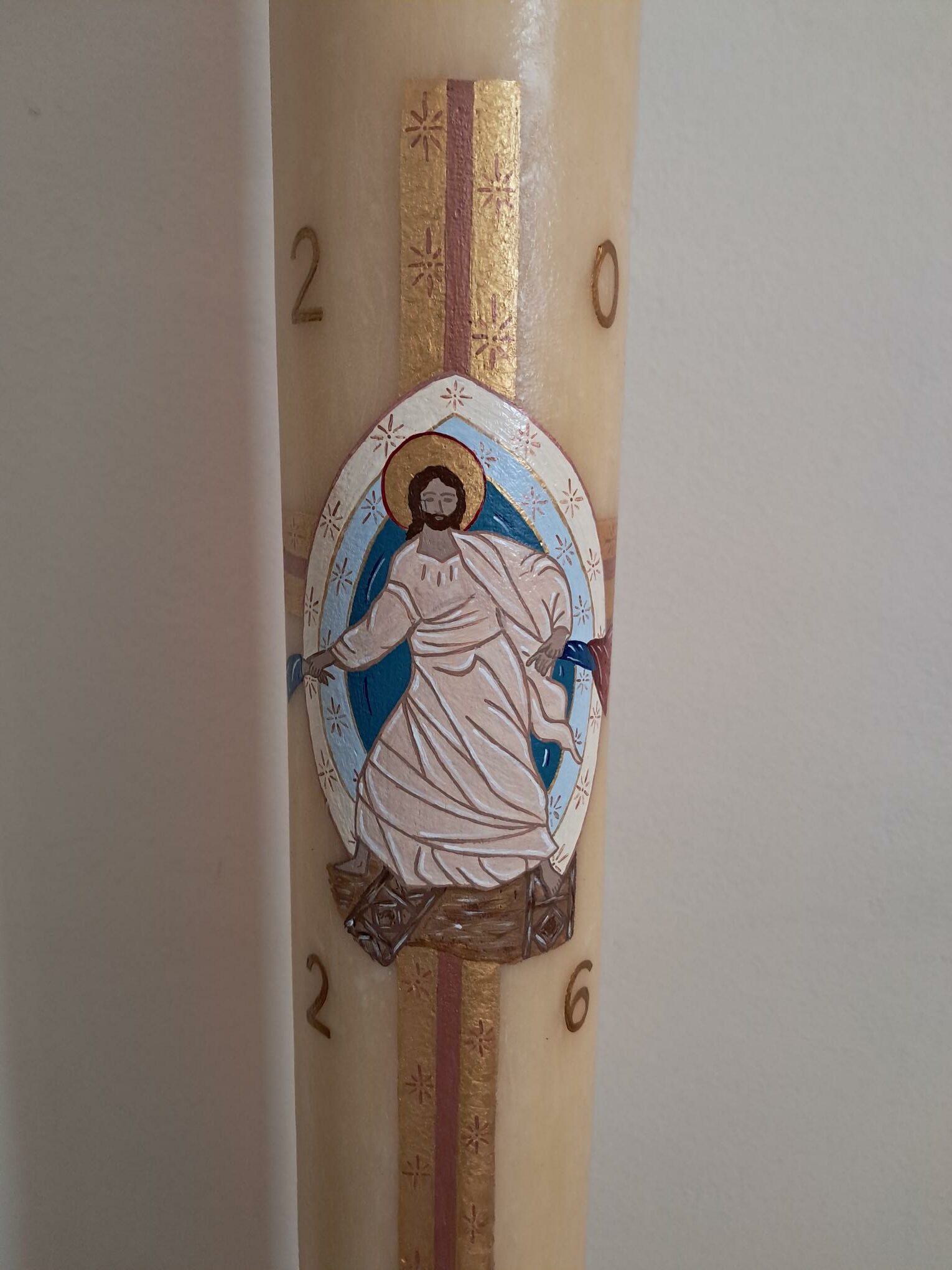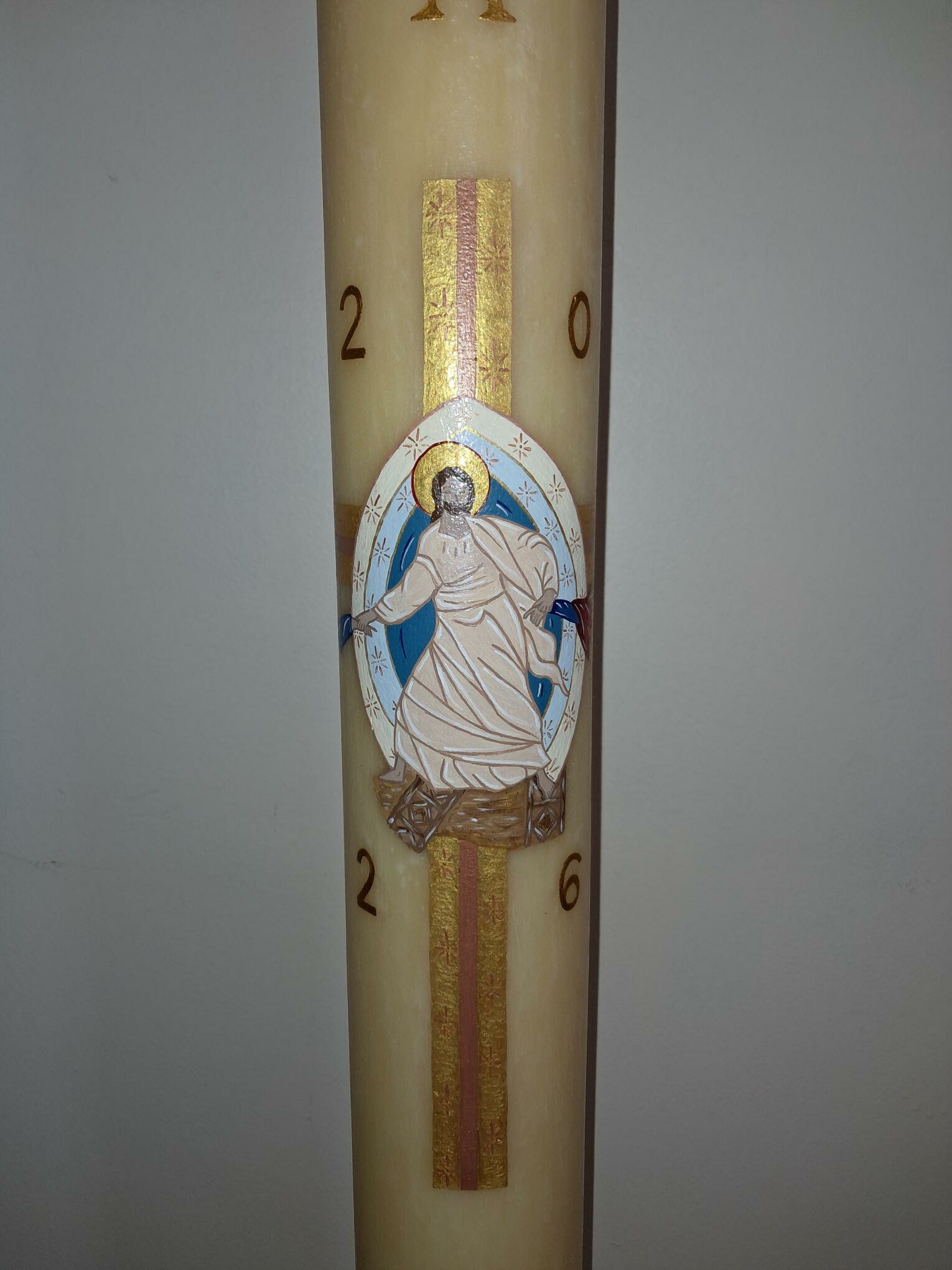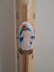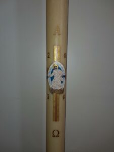 Avoir la possiblité de peindre le cierge pascal d’une paroisse est un grand privilège et un grand honneur. Il représente le Christ « Lumière du monde ».